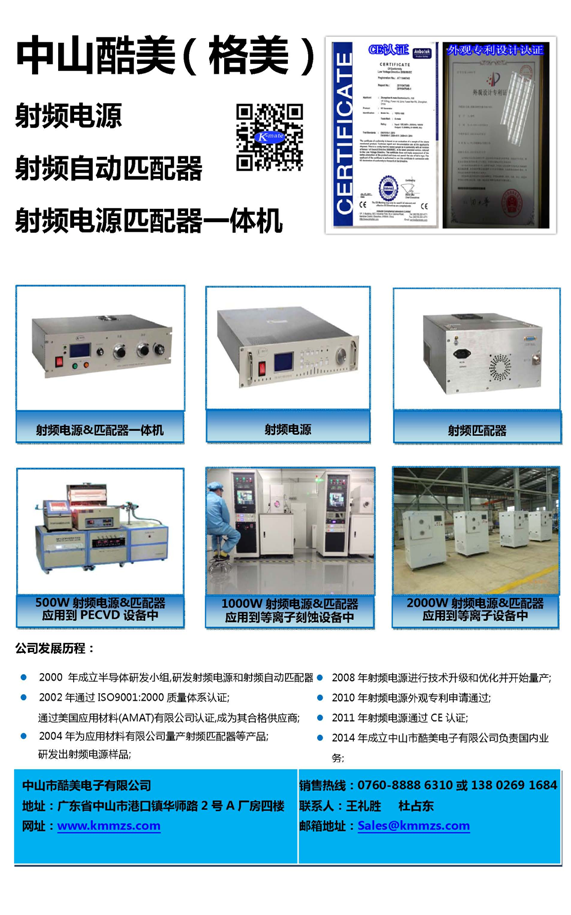 中山市酷美電子有限公司是一家專業(yè)從事半導(dǎo)體制造設(shè)備研發(fā)、設(shè)計(jì)和制造的高科技合資企業(yè)。產(chǎn)品主要有射頻電源、射頻自動匹配器、射頻功率分配器,廣泛用于太陽能光伏系統(tǒng)、PECVD、真空鍍鏌、刻蝕等真空設(shè)備當(dāng)中。公司于2000年進(jìn)入半導(dǎo)體領(lǐng)域,已有15年豐富的行業(yè)經(jīng)驗(yàn)。2002年,成為全球最大的半導(dǎo)體設(shè)備制造商AMAT(美國應(yīng)用材料公司APPLIED MATERIALS INC)認(rèn)證的供應(yīng)商,并為AMAT大批量制造射頻匹配器等產(chǎn)品,每年DMR比率控制在1%之內(nèi)。